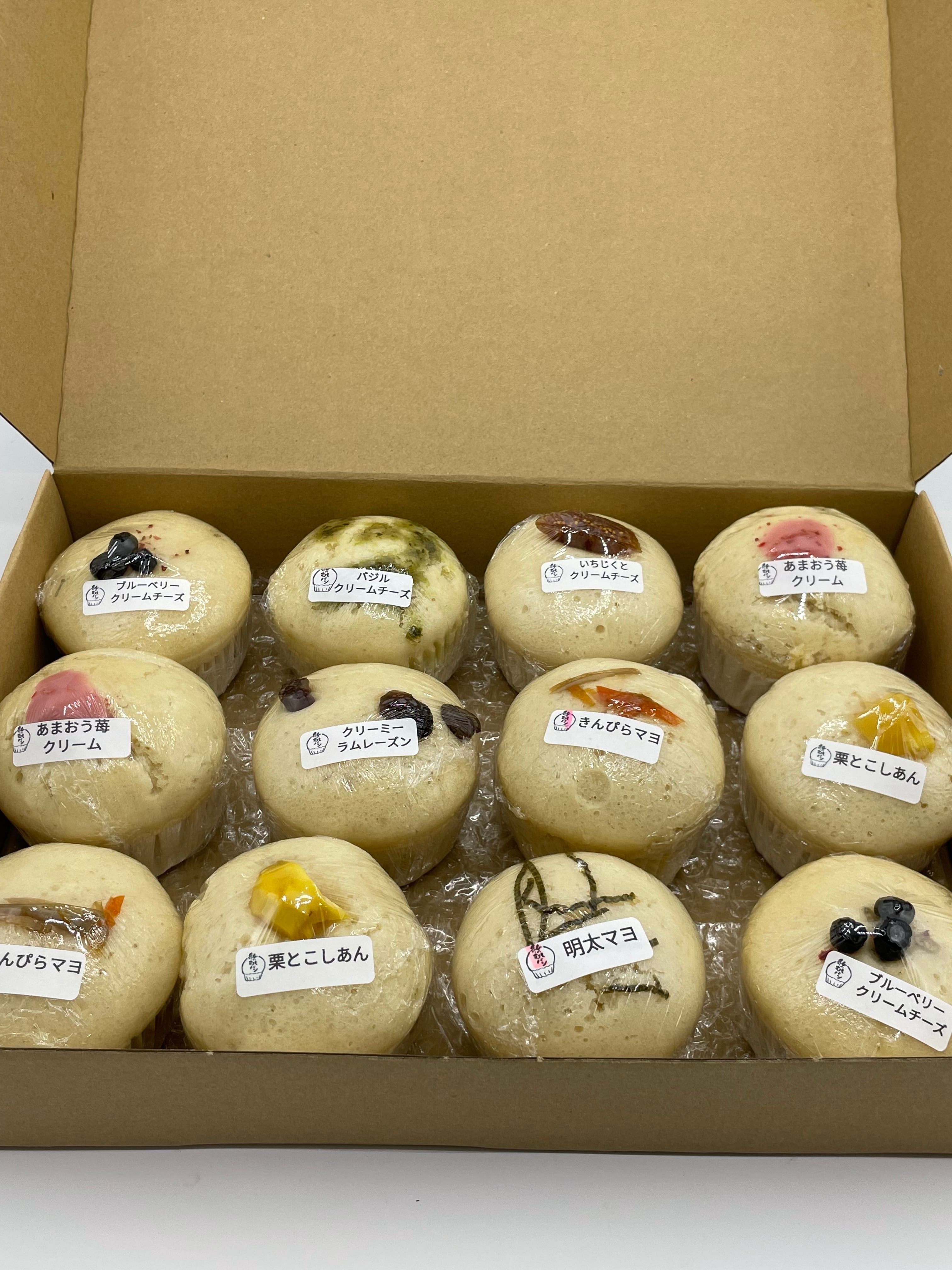 その日に蒸しあげたむしパンを12個セットでいかがでしょうか。甘い系、惣菜系、半々の割合でセットにいたします。