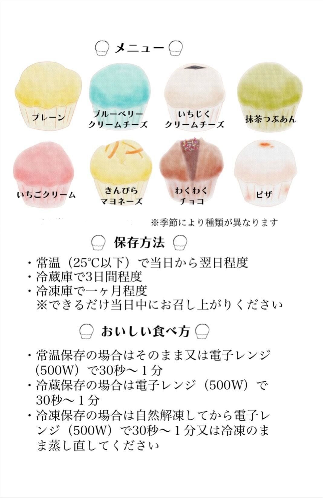 画像は一例であり、実際の内容は異なる場合がありますその日に蒸しあげたむしパンを8個セットでいかがでしょうか。甘い系、惣菜系、半々の割合でセットにいたします。